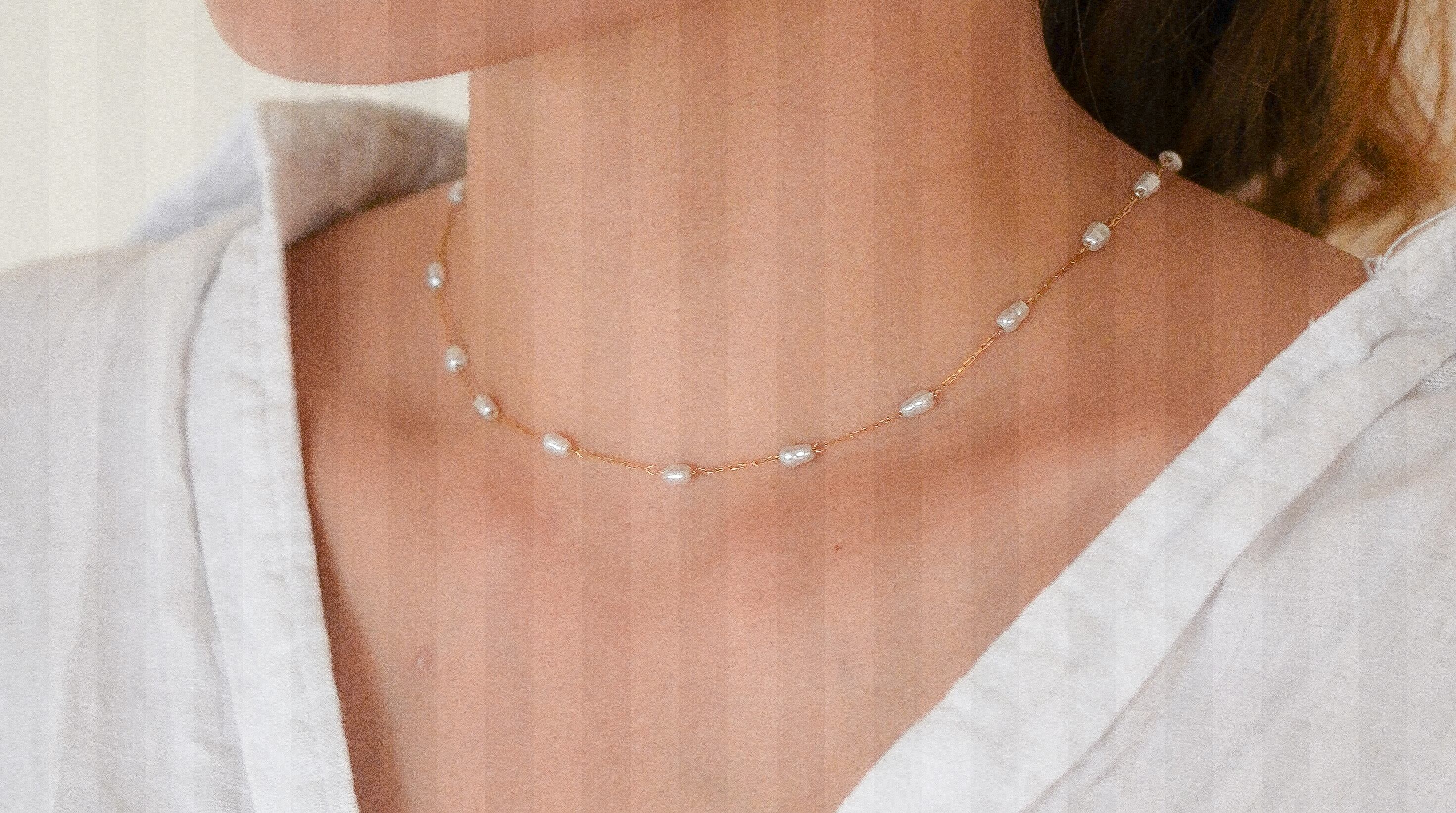 細めのゴールドチェーンとパールを組み合わせた